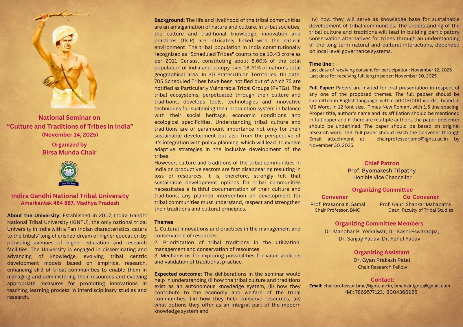 A National Seminar on “The Culture and Traditions of Tribes in India” will be organized by the Birsa Munda Chair on November 14, 2025.
